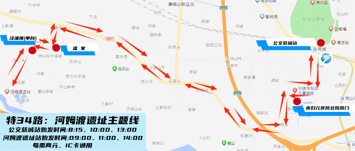 該線從公交慈城站出發(fā),沿途經(jīng)過市婦兒醫(yī)院北院南門、潘家、涇浦庵(單向),最終到達河姆渡遺址。公交慈城站始發(fā)時間分別為8:15、10:00、13:00,河姆渡遺址站始發(fā)時間分別為09:00、11:00、14:00,單程45分鐘,市民朋友可乘坐軌道交通4號線至慈城站后換乘特34路前往河姆渡遺址。