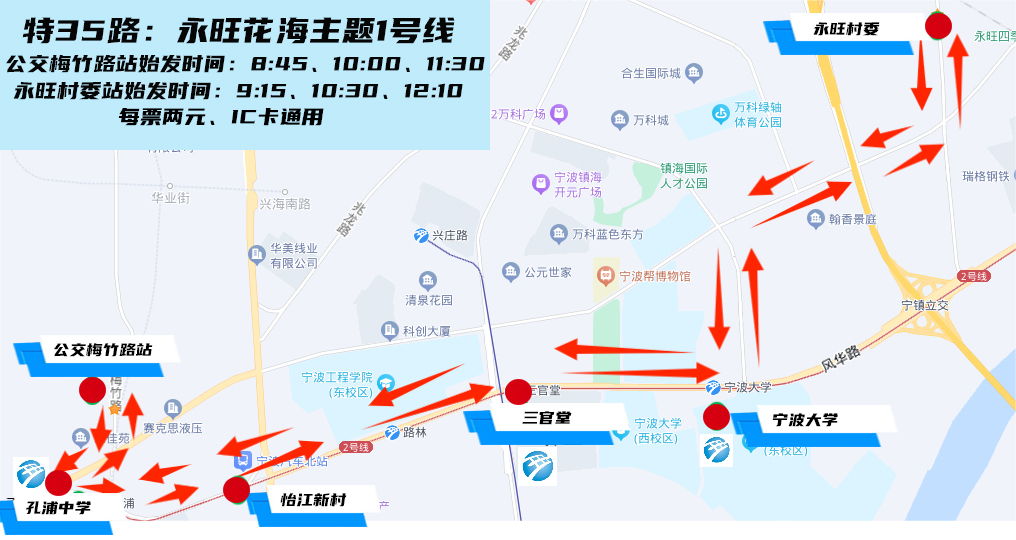該線沿途經(jīng)過公交梅竹路站↓、梅竹路中官新路口↑、孔浦中學、怡江新村、三官堂(浙江紡織服裝學院)、寧波大學,最后抵達永旺村。公交梅竹路站始發(fā)時間分別為:8:45、10:00、11:30,永旺村委站始發(fā)時間分別為:9:15、10:30、12:10。單程20分鐘,線路沿線經(jīng)過軌道二號線孔浦站、三官堂(浙江紡織服裝學院)站、寧波大學站,市民朋友可在這些站點進行換乘。