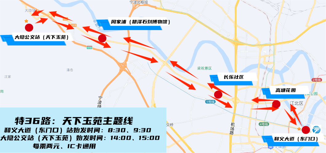 該線從和義大道(東門口)出發(fā),沿途經(jīng)過高塘花園、長樂社區(qū)、周家浦(耕澤石刻博物館),最后達到大隱公交站(天下玉苑)。和義大道(東門口)站始發(fā)時間分別為:8:30、9:30,大隱公交站(天下玉苑)始發(fā)時間分別為:14:00、15:00,