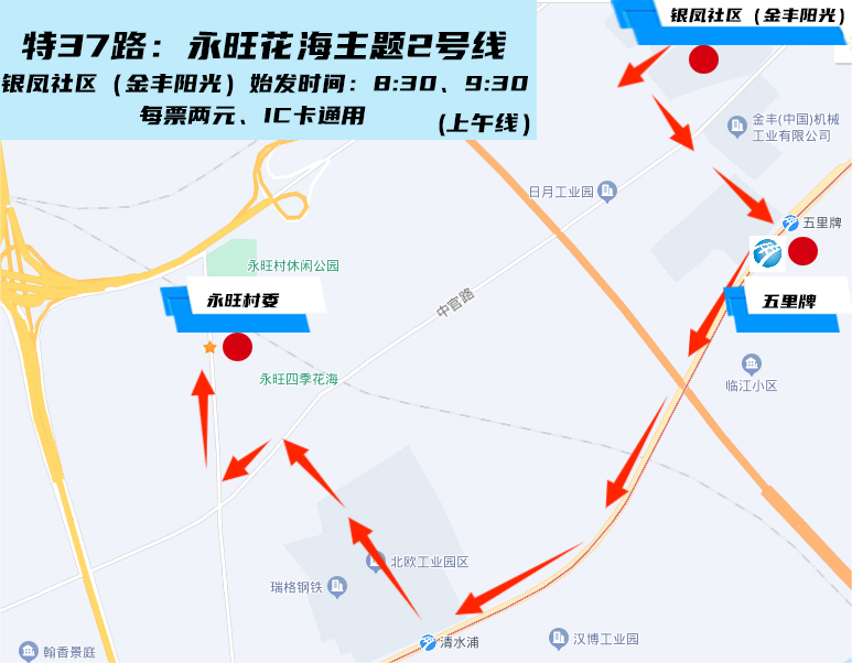 該線單程15分鐘,上午從銀鳳社區(qū)(金豐陽光)公交站出發(fā),途經(jīng)軌道二號線五里牌站后,最后到達永旺村委,始發(fā)時間有兩班分別為8:30和9:30,下午從永旺村委站出發(fā),兩班時間分別為13:30、14:30,先后在銀鳳社區(qū)(金豐陽光)、五里牌站?。