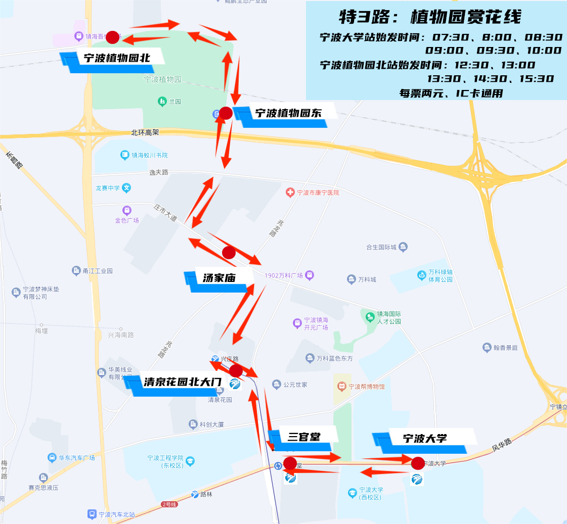 該線從寧波大學、三官堂(浙江紡織服裝學院)、清泉花園北大門、湯家廟、寧波植物園東、寧波植物園北。寧波大學站始發(fā)時間:07:30、8:00、08:30、09:00、09:30、10:00 。寧波植物園北站始發(fā)時間:12:30、13:00、13:30、14:30、15:30。單程時間20分鐘。線路沿線經(jīng)過軌道交通2號線寧波大學站、三官堂(浙江紡織服裝學院)站、軌道交通5號線興莊路站,市民可進行公交地鐵換乘。