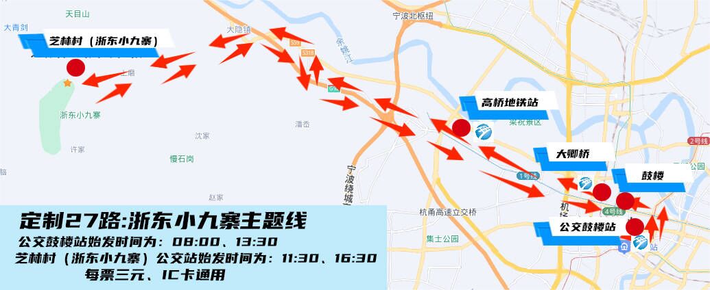 該線從公交鼓樓站出發(fā),沿途經(jīng)過鼓樓、大卿橋↓、中山西路翠柏路口↑、高橋地鐵站,最后到達芝林村(浙東小九寨),公交鼓樓站始發(fā)時間為 08:00、13:30,芝林村(浙東小九寨)公交站始發(fā)時間為:11:30、16:30。單程80分鐘,線路沿線經(jīng)過軌道交通1號線鼓樓站、大卿橋站、高橋站,可進行公交換乘。該線三元一票制,IC卡通用。