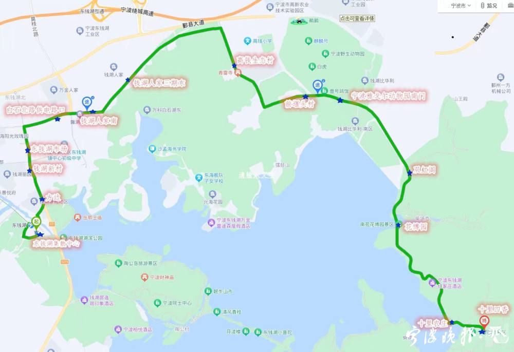 設(shè)置站點(diǎn):東錢湖集散中心、方邊、錢湖新村、東錢湖市場、白石北路供電路口、錢湖人家南、錢湖人家三期東、高錢生態(tài)村、前堰頭村、寧波雅戈?duì)杽游飯@南門、雙虹閣、花博園、十里農(nóng)莊、十里四香站。