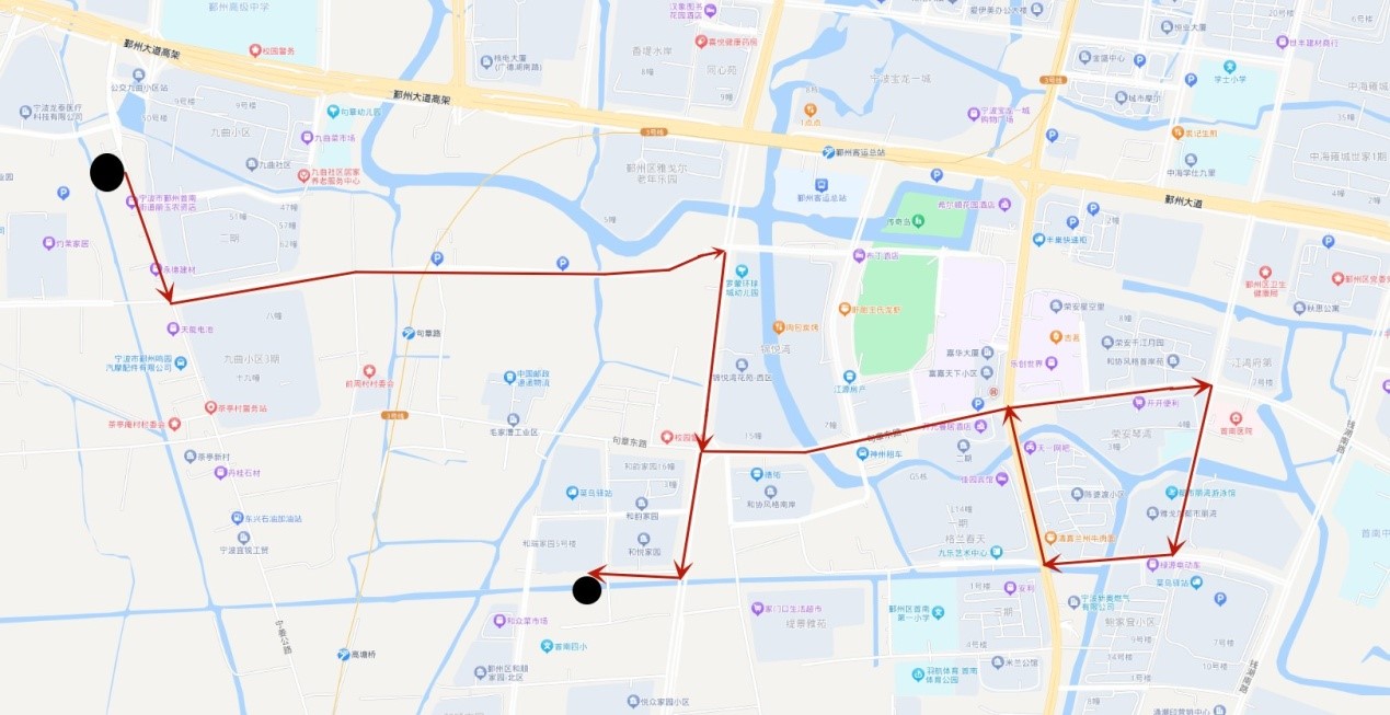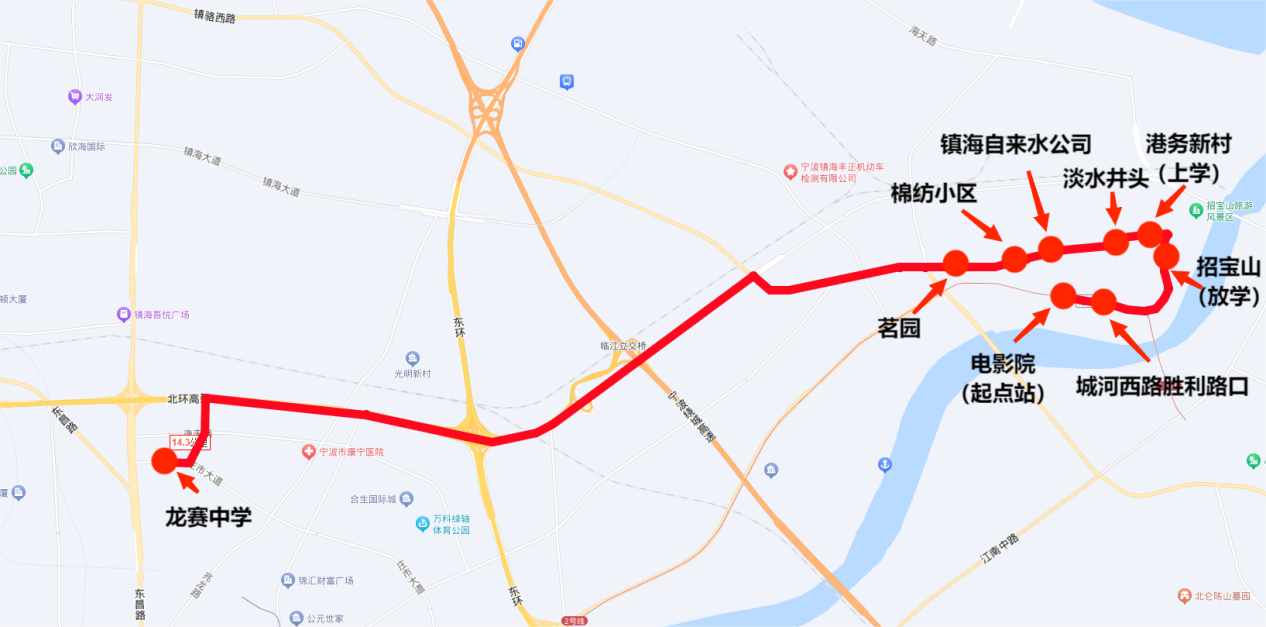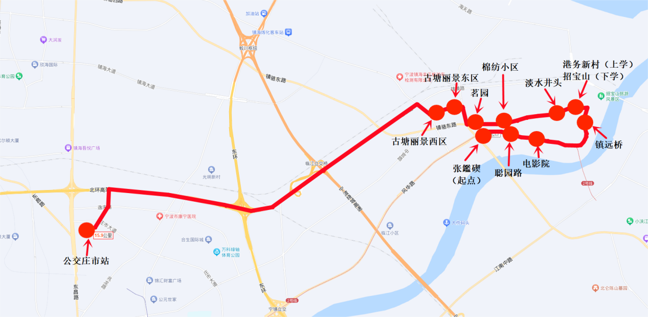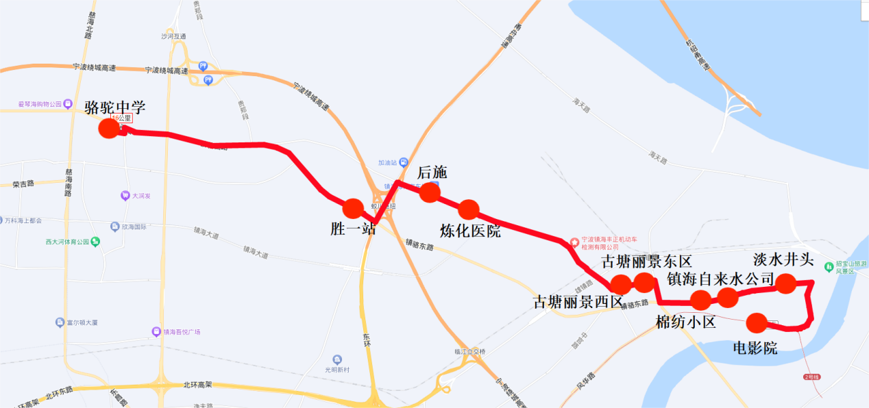 站點設(shè)置:公元世家、莊市街道行政服務(wù)中心、漢塘路逸夫路口、招呼站(鎮(zhèn)海區(qū)實驗小學南門)