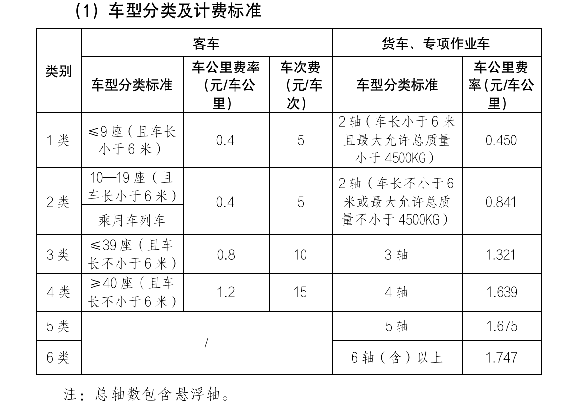 相關(guān)車型的收費里程,詳見下表(最終收費標準以省政府批復(fù)為準):
