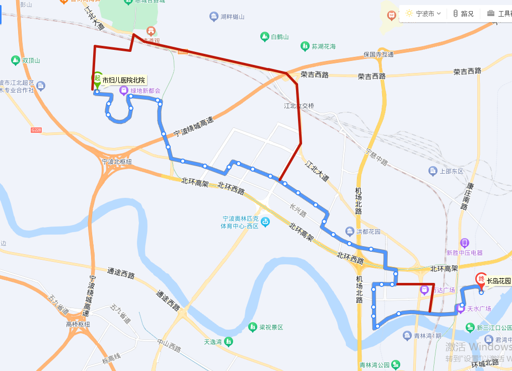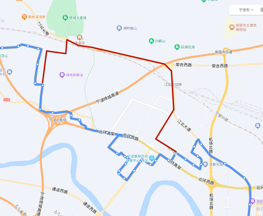 1.調(diào)整走向:江北連接線慈浦路口后改走慈浦路、慈江西街、保黎南路、寧慈西路、江北大道、廣元路、廣元路長興路口后恢復(fù)原線運(yùn)營。