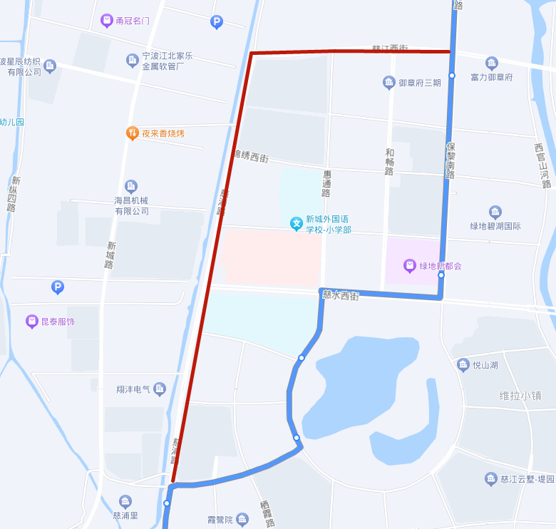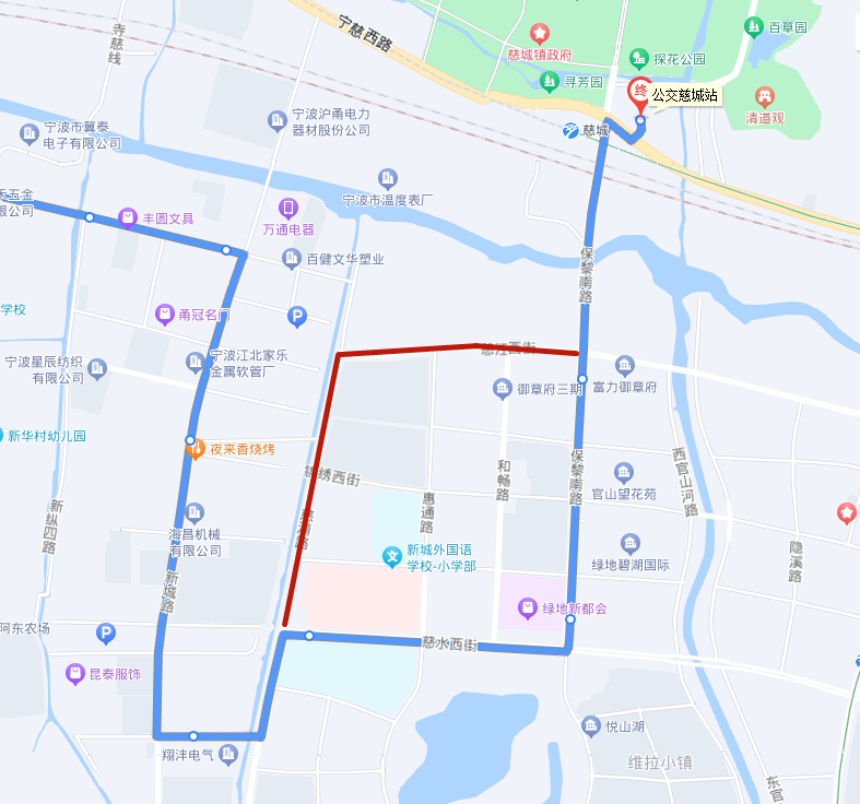 1.調(diào)整走向:保黎南路慈江西街口后改走慈江西街、慈浦路、慈浦路隨園街口后恢復(fù)原線運(yùn)營。