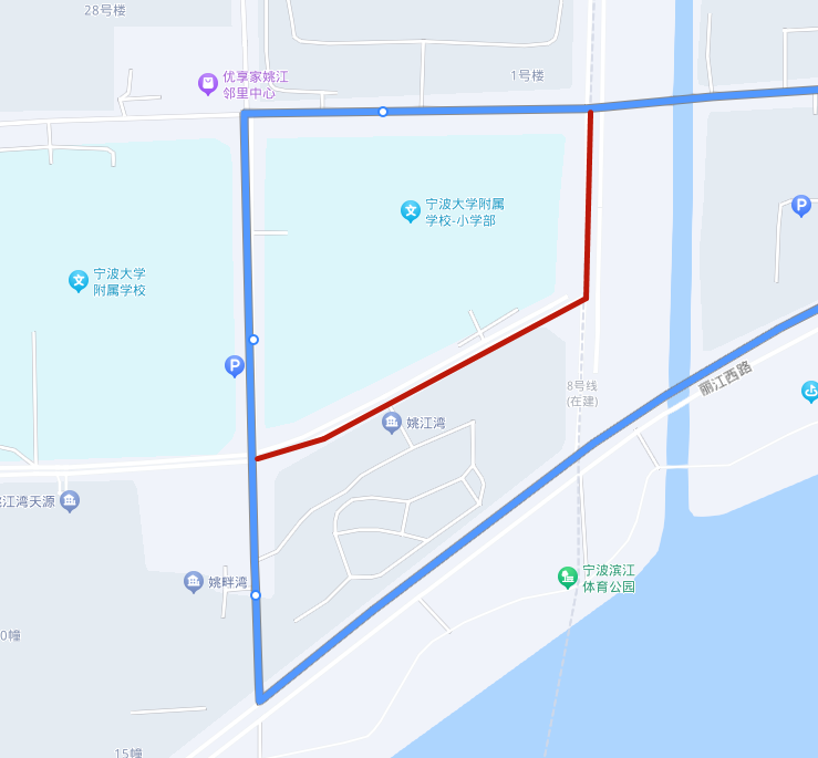 祥北路(第九醫(yī)院)、孫家麗園東、寧波大學(xué)附屬學(xué)校、麗江西路祥北路口↓、祥北路麗江西路口↑、麗江西路北海南路口?空军c(diǎn)。