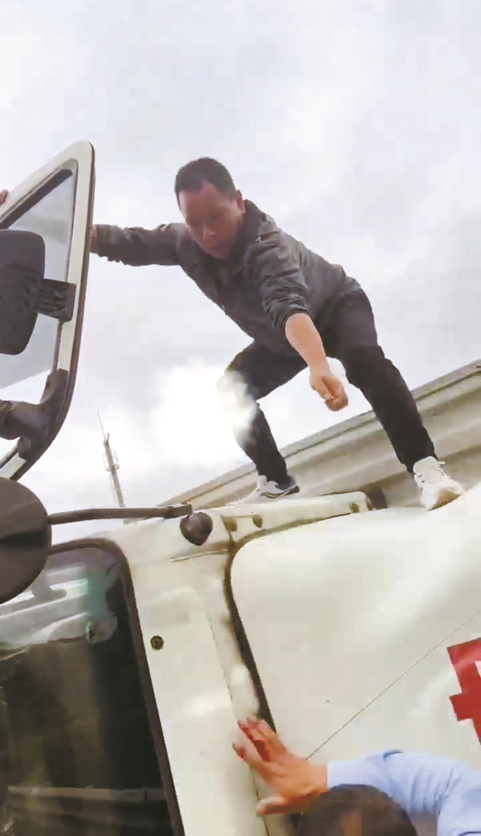 公共視頻顯示,一輛小型轎車靠邊停車,一男子立即下車沖到事故車前,果斷爬上車頂,掀開車門。同時,又有2名熱心司機(jī)趕來幫忙。大家一起努力,將被困司機(jī)及時拉出車門。