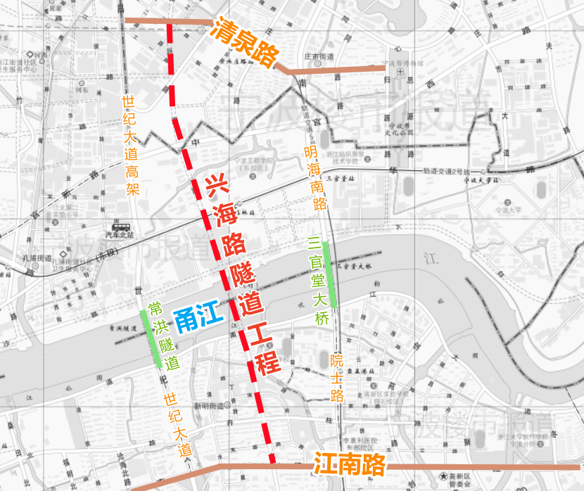 該隧道工程涉高新區(qū)、江北區(qū)、鎮(zhèn)海區(qū),南起江南路,向北穿越甬江后,止于清泉路,全長約3.6公里。