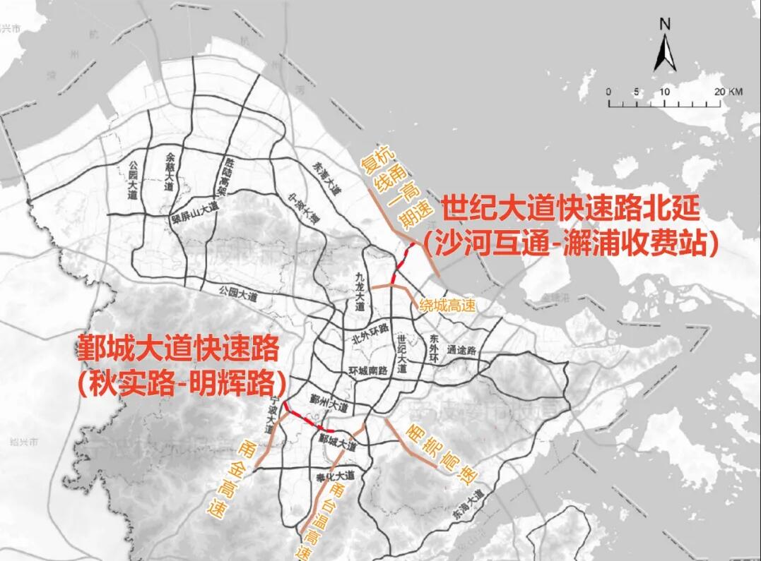 2條快速路,分別是世紀大道快速路北延(沙河互通-澥浦收費站)、鄞城大道快速路(秋實路-明輝路)。