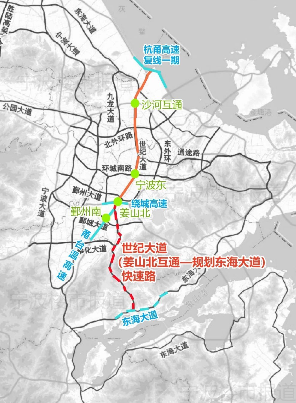 上圖中的全段世紀大道快速路,最北的一段——從沙河互通至澥浦接杭甬高速復線一期,前陣子已與興海路隧道、鄞城大道快速路(秋實路-明輝路)等工程一起啟動方案征集。