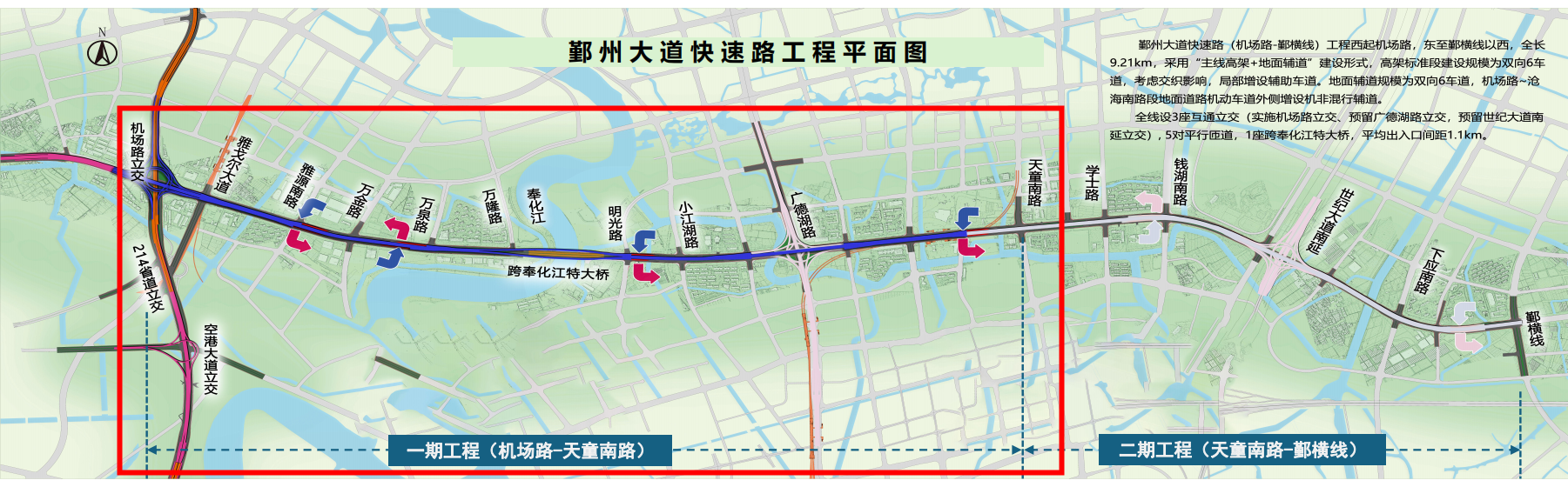 采用“主線高架+地面輔道”的建設形式,自西向東依次與機場路高架、雅戈爾大道、雅源南路、萬金路、萬泉路、萬隆路、奉化江、明光路、寧姜公路、小江湖路、廣德湖路相交。