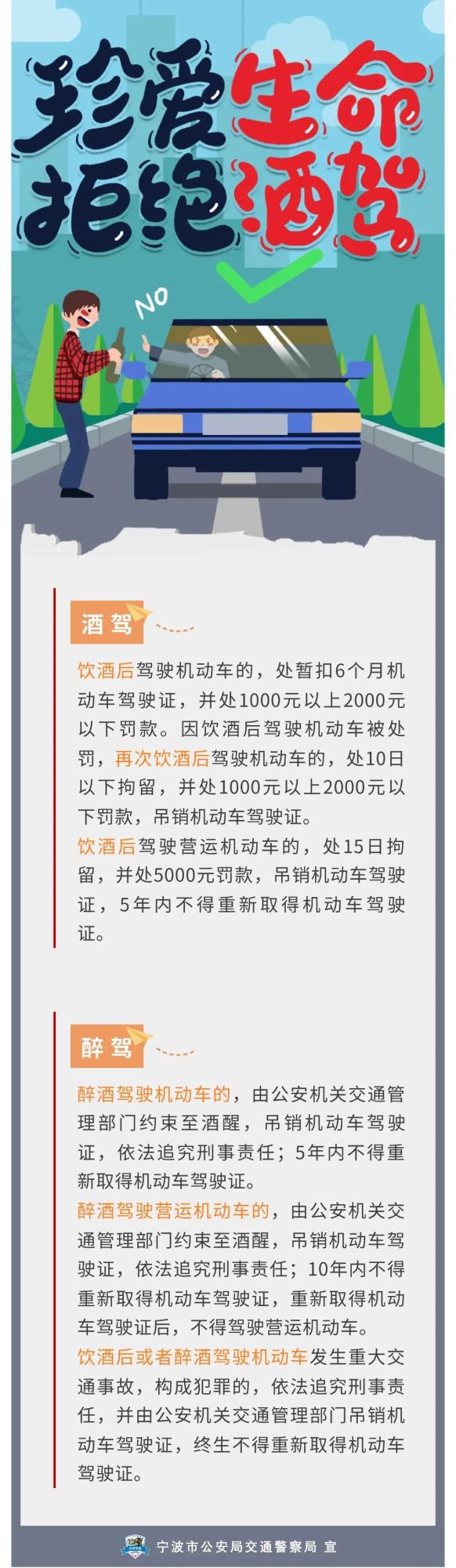 “今年以來,我們已查處涉酒駕駛違法近1.25萬起。其中,20人因飲酒或者醉酒駕駛機動車發(fā)生重大交通事故并構成犯罪,從而被終生禁駕。”寧波交警相關負責人說,通報數據是為了更好地警醒廣大駕駛員:國慶假期吃吃喝喝歡樂多,莫讓杯中酒誤了事!