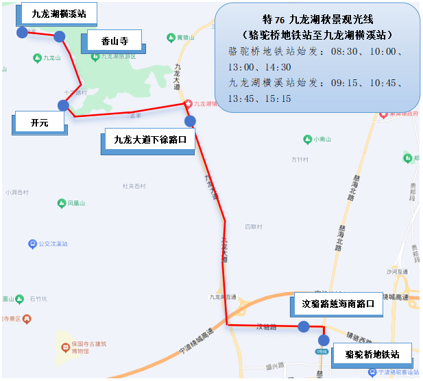 站點設(shè)置:駱駝橋地鐵站、汶駱路慈海南路口、九龍大道下徐路口、開元、香山寺、九龍湖橫溪站。