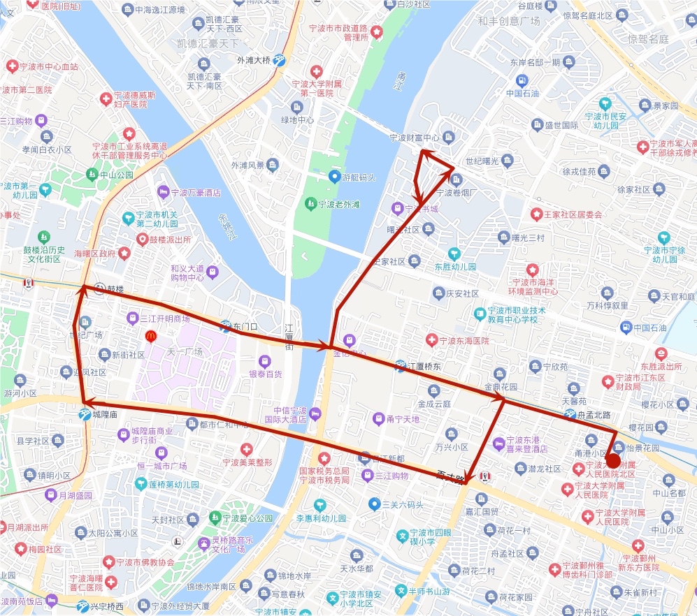 站點設(shè)置:公交甬港新村站、張斌橋、彩虹北路、七塔寺、靈橋東、靈橋西(日新街)、藥行街(中國銀行)、解放南路大梁街口(寧波口腔醫(yī)院)、陽光廣場、東門口(天一廣場)、慶安會館、寧波書城(東勝路)、漁輪廠(招呼站)、寧波書城(東勝路)、慶安會館、江廈橋東(北京銀行)、第九〇六醫(yī)院(德中口腔)、杏陽小區(qū)、張斌橋、公交甬港新村站。