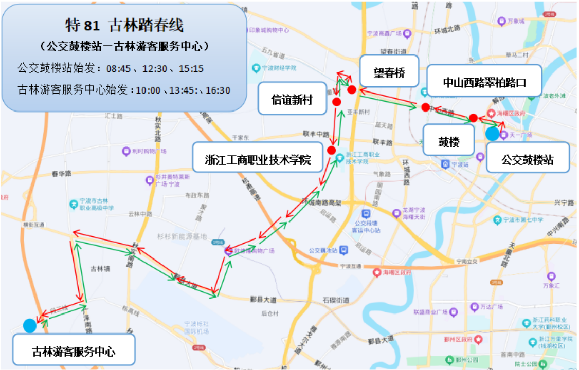 站點(diǎn)設(shè)置:公交鼓樓站、鼓樓、中山西路翠柏路口、望春橋、信誼新村、浙江工商職業(yè)技術(shù)學(xué)院、古林游客服務(wù)中心。