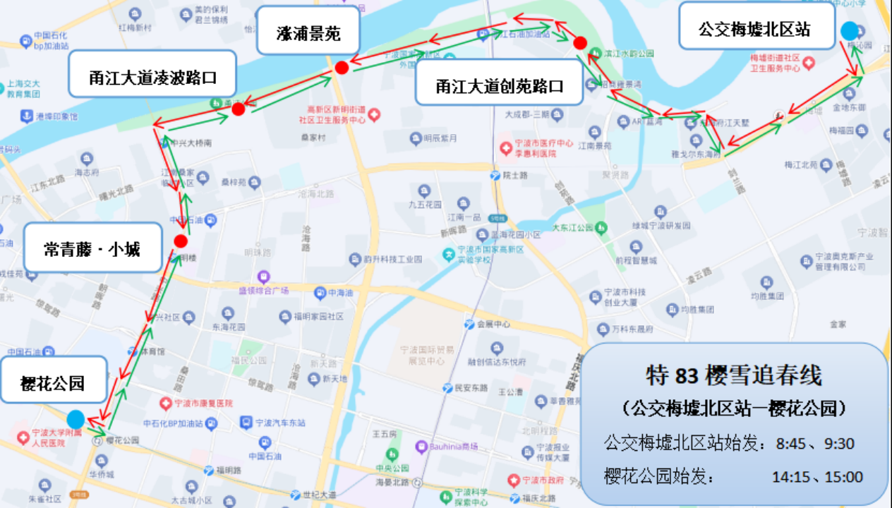 站點(diǎn)設(shè)置:公交梅墟北區(qū)站、甬江大道創(chuàng)苑路口、漲浦景苑、甬江大道凌波路口、常青藤小城、櫻花公園。