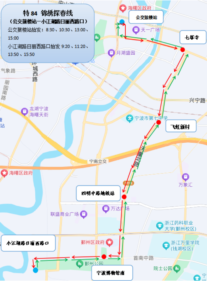 站點(diǎn)設(shè)置:公交鼓樓站、七塔寺、飛虹新村、四明中路地鐵站、寧波博物館南、小江湖路日麗西路口。