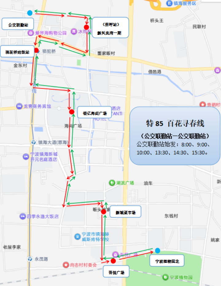 站點(diǎn)設(shè)置:公交聯(lián)勤站、新興嵐灣一期(招呼站)、駱駝橋地鐵站、銀億海尚廣場(chǎng)、新城菜市場(chǎng)、吾悅廣場(chǎng)、寧波植物園北。