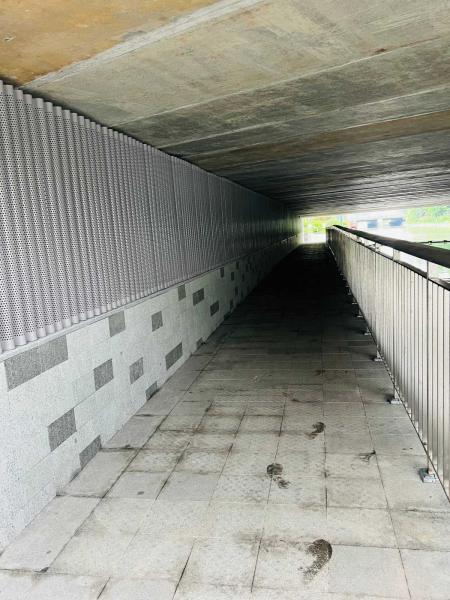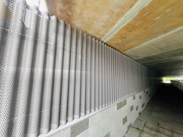 為提升景觀品質(zhì),在下穿通道工程中,市政園林管理科從設(shè)計到施工實施全過程指導(dǎo),在通道入口周邊種植了風(fēng)車茉莉、迷迭香等花境植物,精心打造綠化景觀。通道內(nèi)墻面采用圓形鏤空金屬板裝飾,既隱藏?zé)魩в衷鎏砻栏,夜間通行更顯溫馨。