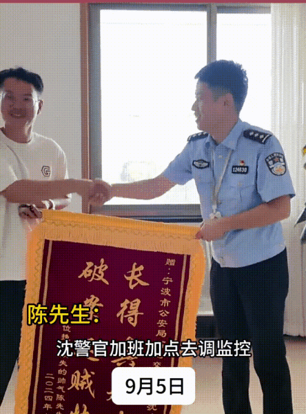 幾天后,陳先生拎著寫有“長得真是帥,破案還賊快”字樣的錦旗找上門,向沈策致謝并稱他為“我見過的最帥警察”。