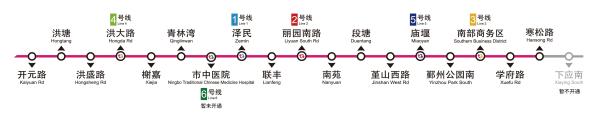 8號(hào)線一期與既有線均設(shè)有換乘:澤民站與1號(hào)線換乘,麗園南路站與2號(hào)線換乘,南部商務(wù)區(qū)站與3號(hào)線換乘,洪大路站與4號(hào)線換乘,廟堰站與5號(hào)線換乘。市中醫(yī)院站與未來(lái)建成的6號(hào)線換乘。