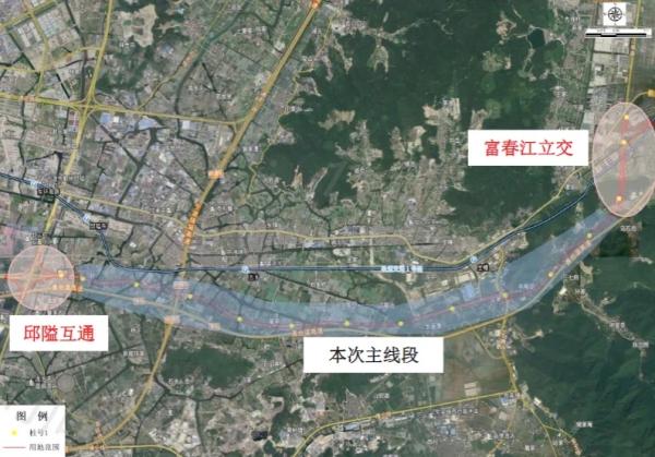批復(fù)文件顯示,環(huán)城南路東延快速路一期工程(主線段)西起邱隘立交,東至富春江路,道路總長約12.3公里。