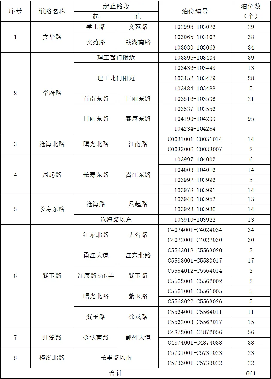 調(diào)整收費(fèi)標(biāo)準(zhǔn)的道路停車位,具體分布及停車位號(hào)如下: