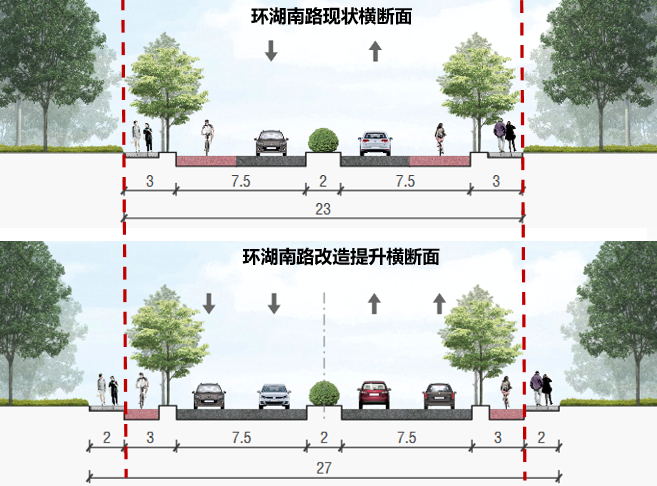 改造提升后,環(huán)湖南路標(biāo)準(zhǔn)段寬度,將從現(xiàn)狀的23米調(diào)整為27米,即從現(xiàn)在的雙向兩車(chē)道拓寬至雙向四車(chē)道。