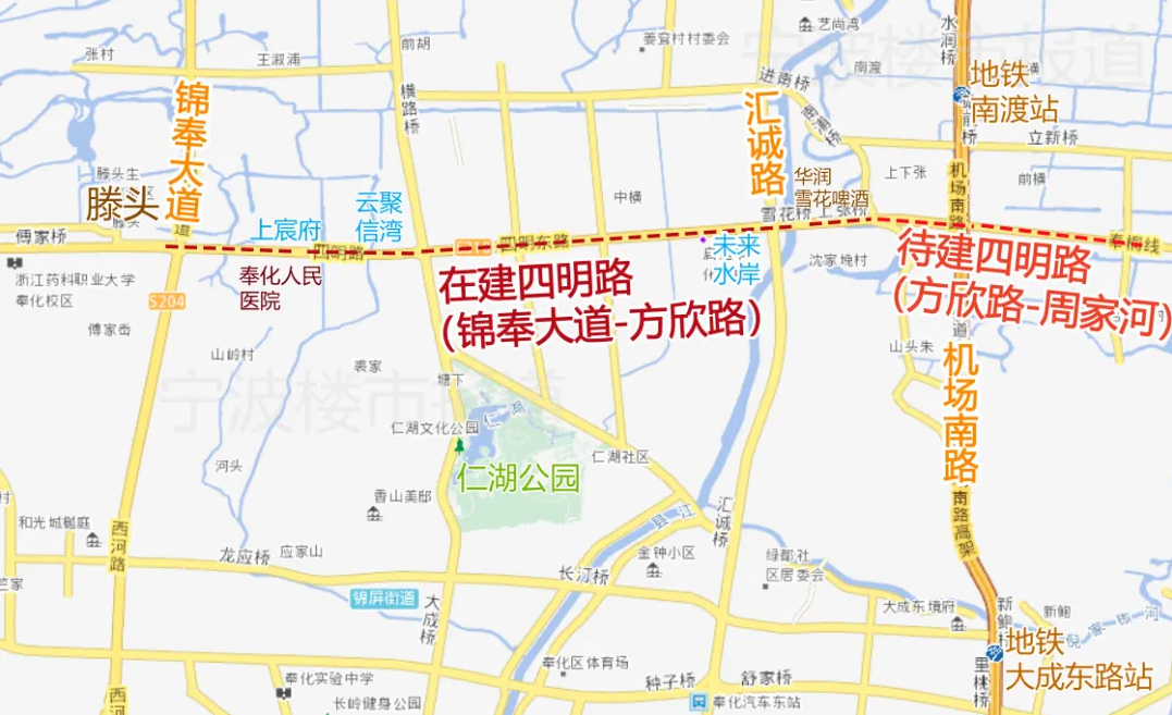 奉化四明路快速化改造在建、待建段示意,據(jù)“天地圖 寧波”標(biāo)注,僅供參考,最終以建設(shè)為準(zhǔn)