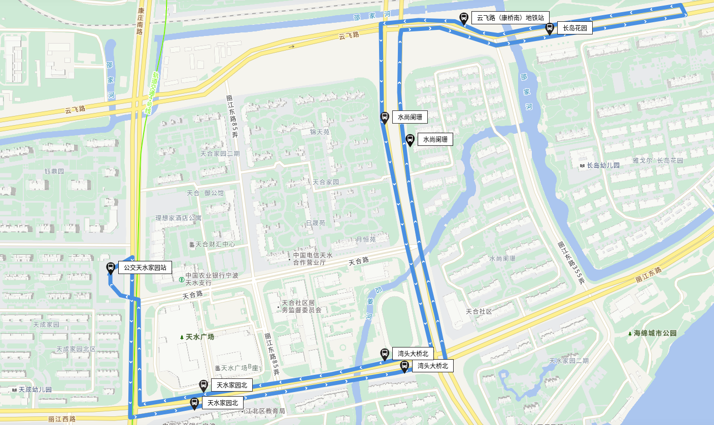 站點設置:公交天水家園站、天水家園北(麗江路地鐵站)、灣頭大橋北、水尚闌珊【云飛路(康橋南)地鐵站】、長島花園(注:位于云飛路)、云飛路(康橋南)地鐵站、水尚闌珊【云飛路(康橋南)地鐵站】、灣頭大橋北、天水家園北(麗江路地鐵站)、公交天水家園站。