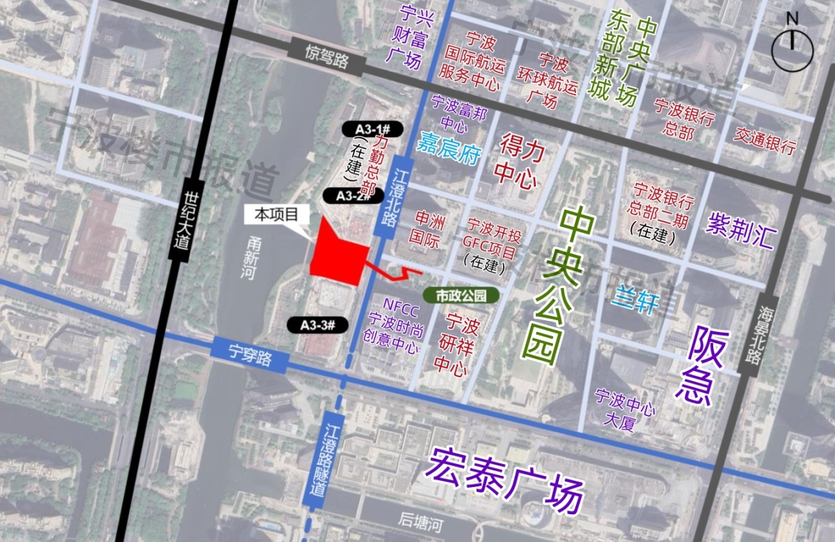 這項工程,主要是建一座跨街人行天橋和一個甬新河畔的公園。項目位置在東部新城核心區(qū)總部大樓林立的區(qū)域,如下圖所示: