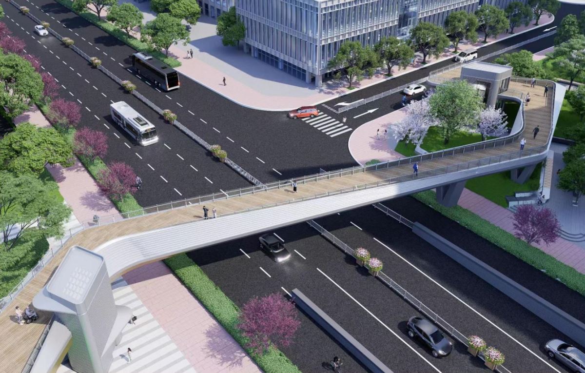 其中,跨街人行天橋從NFCC寧波時尚創(chuàng)意中心北側(cè)往西,橫跨江澄北路,接在建的力勤總部項目至甬新河畔,總長110米。待其建成,市民可從中央公園一直散步到甬新河濱河綠帶。