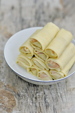 做法:豬肉洗凈用料理機(jī)絞成肉糜,姜切末,蔥切蔥花,開洋提前用料酒浸泡,千張皮洗凈,切成等分長塊,姜、蔥、開洋放入肉糜,放適量鹽、白糖、生抽、料酒拌勻。包千張包子時(shí),取適量肉餡,放在千張皮1/3處,卷起一段,兩邊千張皮往中間疊合繼續(xù)往前卷即成。做好的千張包子可先隔水蒸熟,拿來紅燒或煮火鍋更方便。