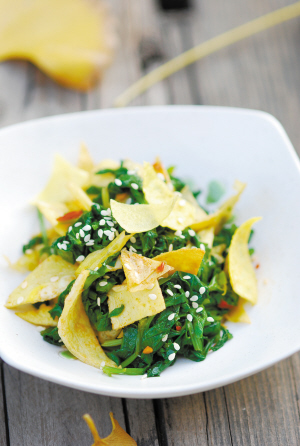 做法:雞蛋打散,用濾網(wǎng)過濾掉泡泡,將蛋液倒入平底鍋中使蛋液均勻鋪開。開大火,迅速煎至蛋皮邊與鍋壁分離,翻面再煎上三四秒鐘即可,煎好的蛋皮切菱形塊。將芹菜葉洗凈,鍋中放清水,滴兩滴油,煮開,放入芹菜葉便可關(guān)火,兩三秒后撈出瀝水。晾一下切小段,放適量鹽、芝麻油、白糖、生抽、醋、辣椒醬,放蛋皮,拌勻入味,最后撒些芝麻即可。