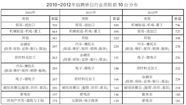 2010-2012年招聘單位行業(yè)類別前10位分布