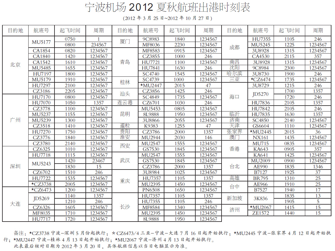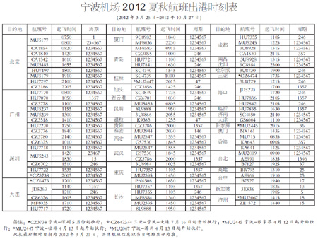 寧波機(jī)場(chǎng)2012夏秋航班出港時(shí)刻表