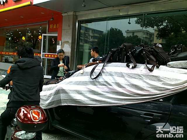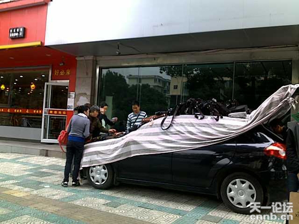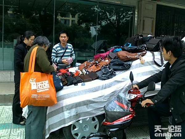 寧波手機(jī)報(bào)讀者139****8094:在櫻花小區(qū)路邊上,一“小販”用私家車做起了售貨亭,蓋在車身的布上放滿了各種各樣的包包,生意還不錯(cuò)呢!哈哈!有“創(chuàng)意”,但會(huì)影響交通喲!