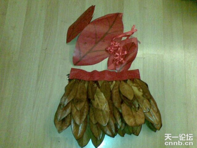 寧波手機報讀者139****8094:昨晚在一朋友家喝茶,朋友上幼兒園的女兒按老師的要求,用樹葉創(chuàng)意制作了一條美麗又環(huán)保的裙子!很不錯喲!