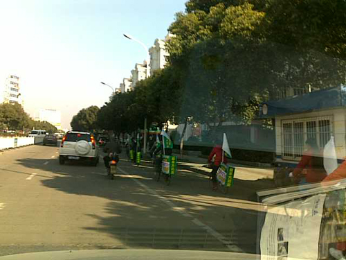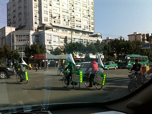 寧波手機報讀者139****8094:在大街小巷人們時不時會看見各種各樣打著廣告的車輛出沒,這是偶今天上午在桑田路百丈路口看到的自行車廣告車隊,好象是一家藥店的廣告!哈哈!商家真是大廣告做不起小廣告也能行。