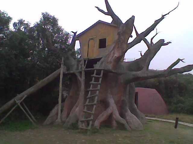 中國寧波網(wǎng)手機記者158****5237:這是一棵光禿的空心古樹,樹上有一間小空房子連通,可以從樹里的鐵鏈爬上去鉆出房子玩旁邊石制的滑梯,原本樹枝上還有鐵鏈掛得鋪有木板的秋千,怎么樣,酷吧?!