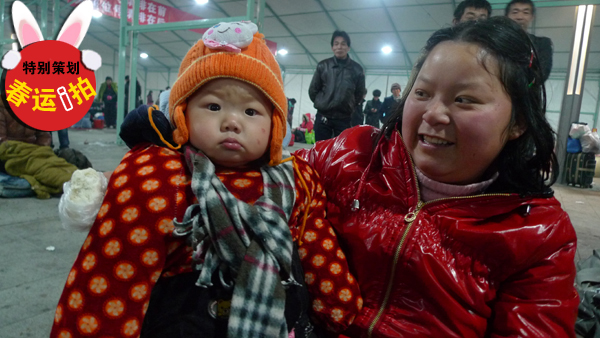 張雪媛抱著10個(gè)月大的兒子在寧波火車東站臨時(shí)候車大棚等車。