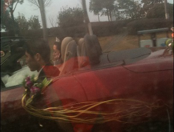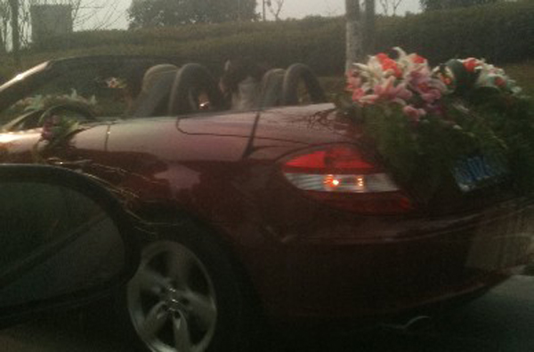 拍攝于上周六(1月15日)江東南路,天空不時飄著白雪,有人卻開著敞蓬跑車接新娘,穿著一身白色婚紗的新娘子坐在副駕駛位置上,一邊還打著電話,看看都覺得冷,真有點替她擔心了,新婚的大喜日子可別感冒了!