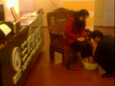 中國寧波網(wǎng)手機(jī)記者150****3535:寧波蘭舍硅藻泥公司的苗總為最優(yōu)秀員工洗腳。