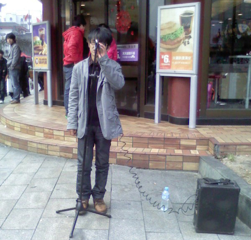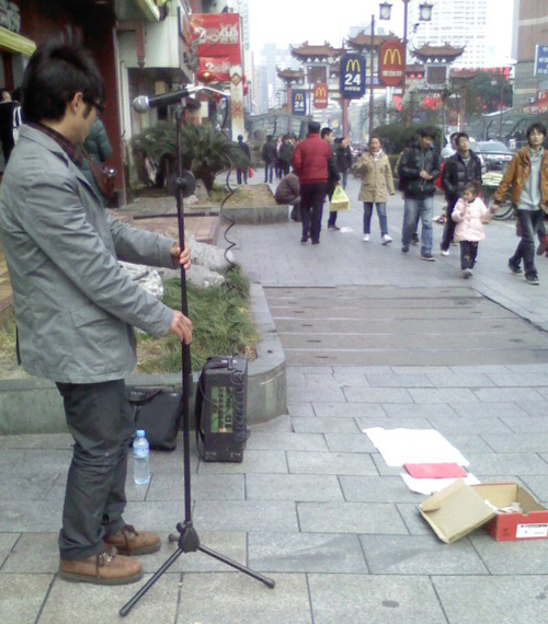 中國寧波網(wǎng)手機(jī)記者134****7350:今天是個浪漫的節(jié)日:情人節(jié)!中午外出吃飯?zhí)炜者飄著雪花,路過城隍廟麥當(dāng)勞時被一流浪歌手的“單身情歌”吸引住了,聽他唱得還蠻有種流浪歌手的味道,四圍也圍滿了觀眾......