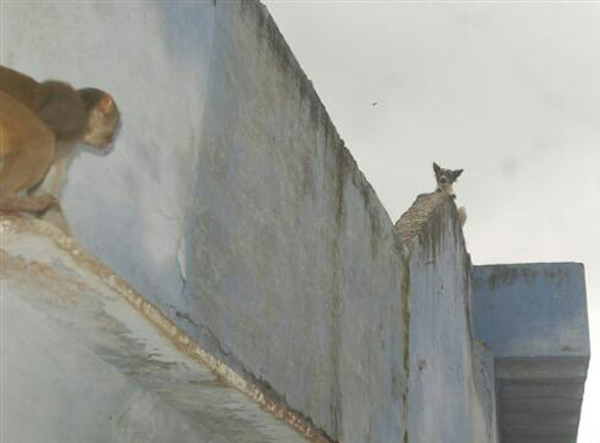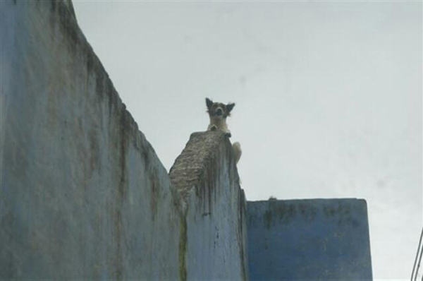 中國(guó)寧波網(wǎng)手機(jī)記者139****8094:一只狗狗蹲守墻頭,一只猴子欲逮狗狗,猴子墻檐與狗對(duì)峙!猴子爬樹可以爬墻可不行了,猴欲逮狗卻沒那么容易喲!狗狗墻頭高高在上,誰怕誰啊!猴上不來掉下去了,狗狗得意繼續(xù)蹲守墻頭看風(fēng)景……