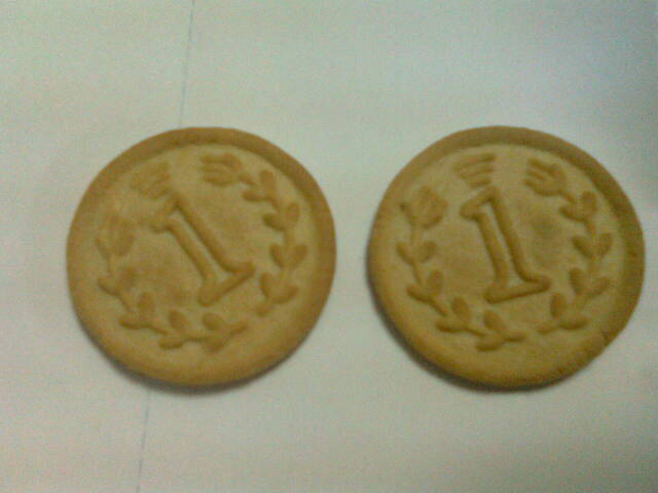 今天上午,在公司和同事一起吃餅干,無意間發(fā)現(xiàn)餅干上的圖案,和我們用的一元硬幣圖案差不多,我們同事開玩笑說:“我們吃一塊餅干就要一元錢了”!