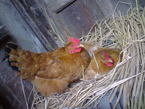 在一農(nóng)家雞窩,一只母雞正在下蛋,另一只跑過來似乎在說:快點,我也要下蛋!哈哈!