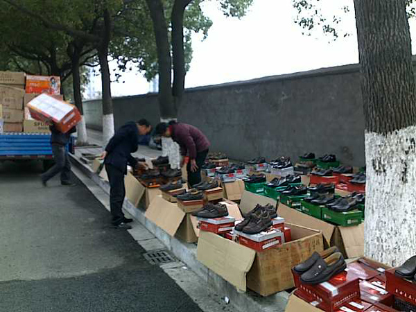 中國寧波網(wǎng)手機記者139****8094:3月1日中午,在姚隘路與寧徐路十字路口加油站西側(cè)的人行道上擺滿了鞋子,商販占道當(dāng)鞋鋪做起街頭了生意!象這樣的汽車流動商販大街小巷時而出沒,城管休息他上班,城管上班他們走人,他們的生意經(jīng)是打一槍換一個地方!有趣的是,當(dāng)偶路過拍照時,商販臉露笑容朝偶小跑過來,邊遞香煙邊說好話……馬上就走,哈哈!商販把我當(dāng)城管便衣了!